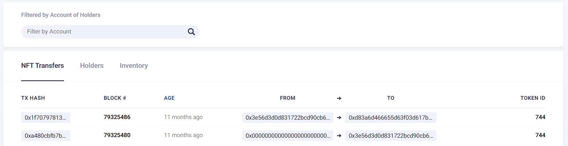 만약 특정 주소와 관련된  토큰 전송 내역을 조회하고 싶다면, 상단 검색창에 주소를 입력하거나, Transfers 내역에서 주소를 클릭하면, 아래 이미지와 같이 해당 주소의 토큰 transfers 내역만 조회 할 수 있습니다.