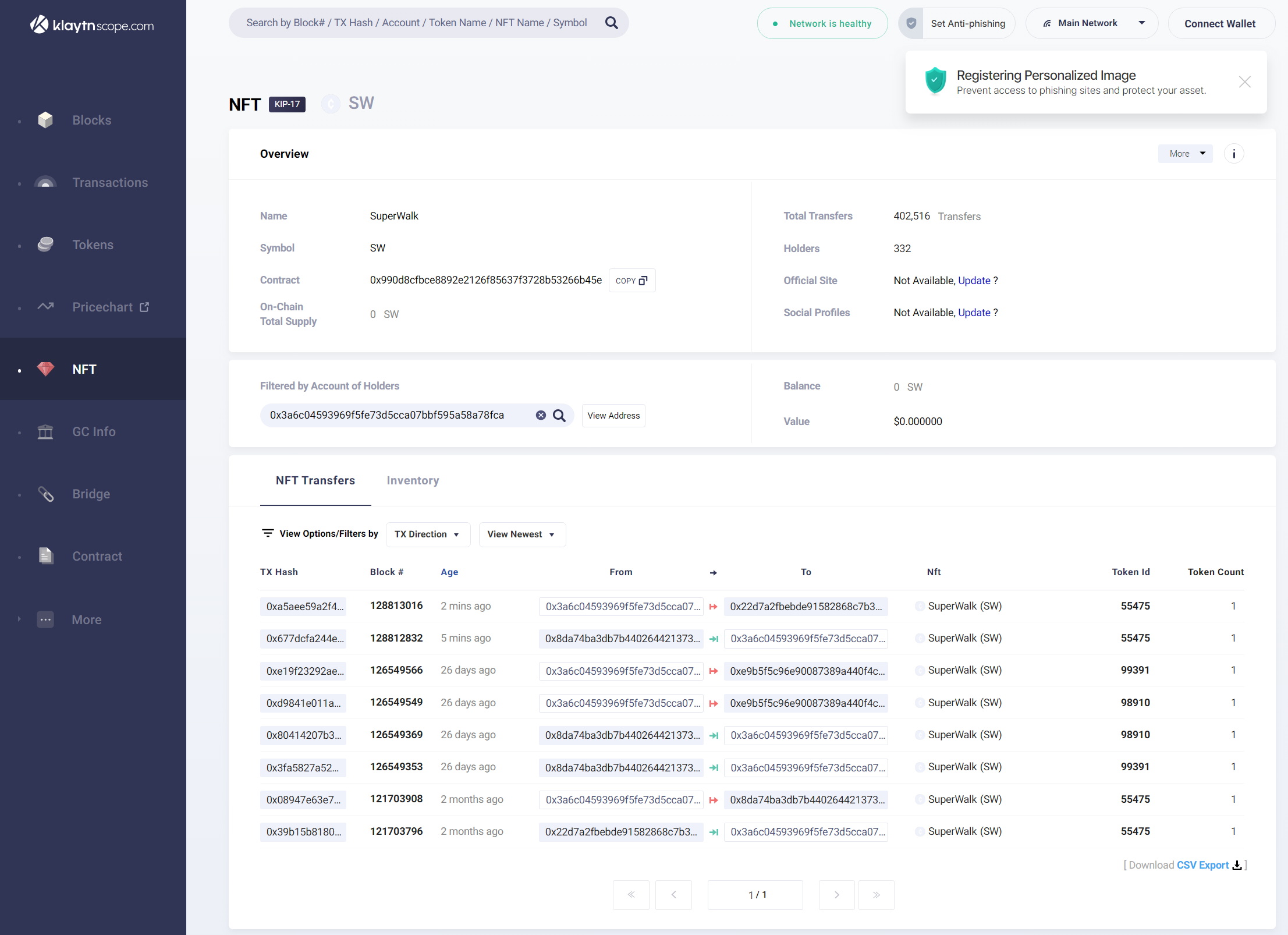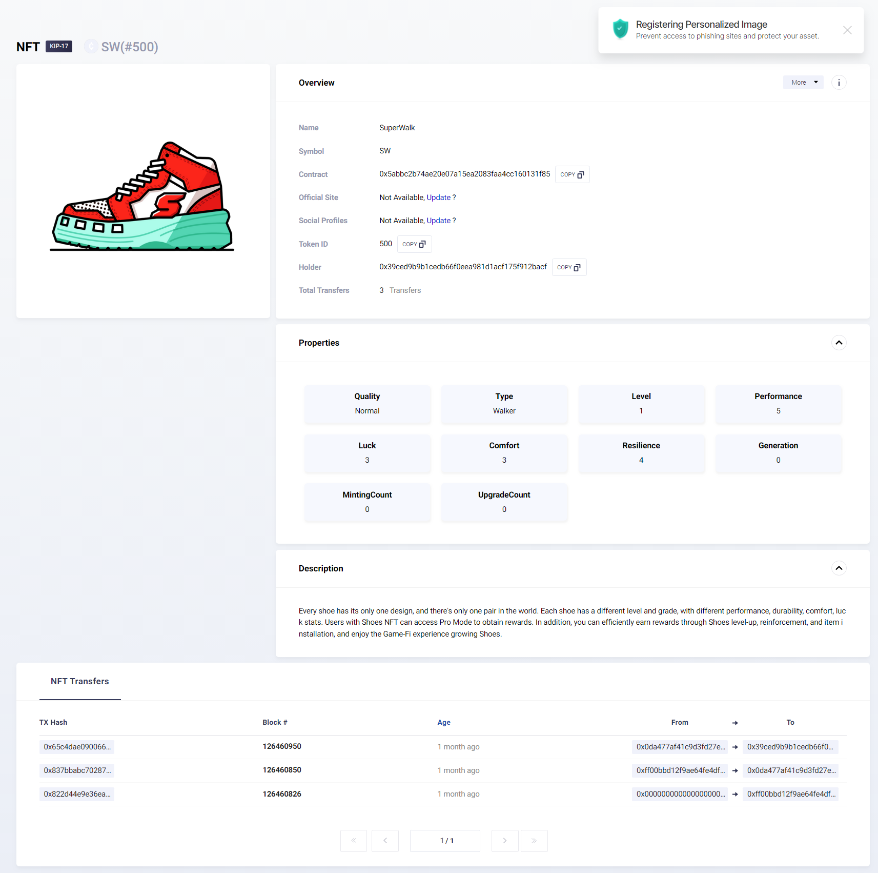 Provides NFT thumbnail, Token ID, and holder address.