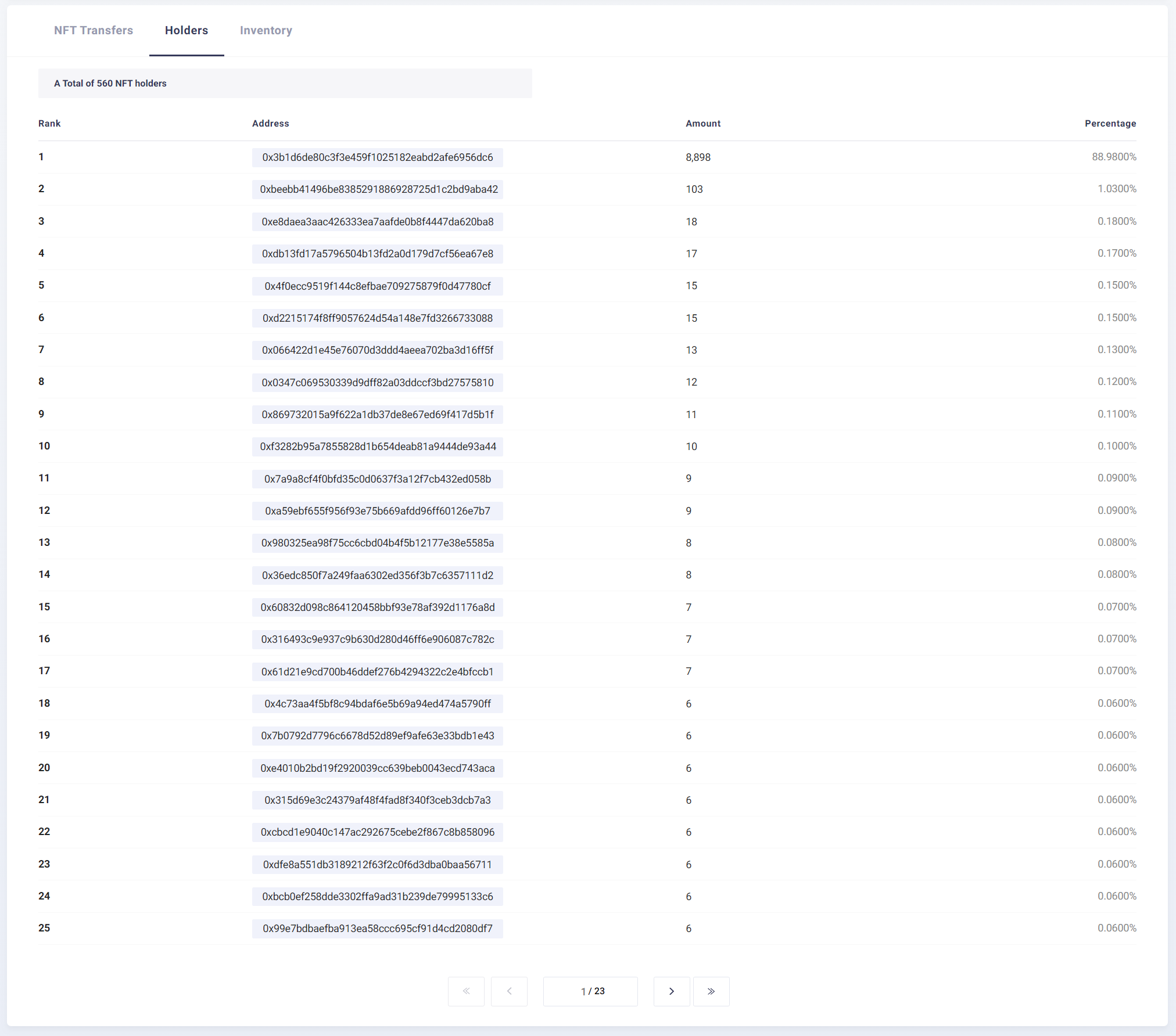 If you want to check the transfer history of a specific address, you can enter the address in the search bar at the top or click the address in the “NFT Transfers” to view only the NFT transfer history of that address, as shown in the image below.