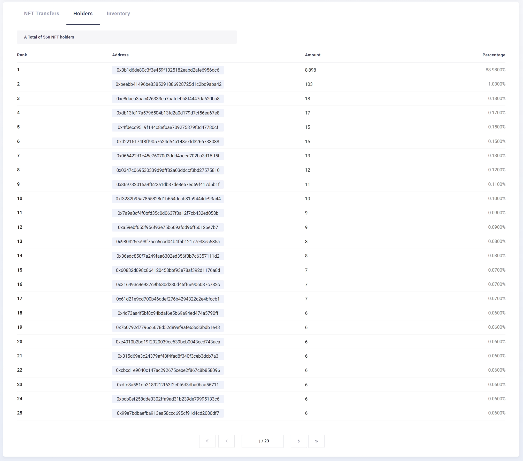 It provides the addresses of the holders, quantity, and percentage of shares of the NFT.