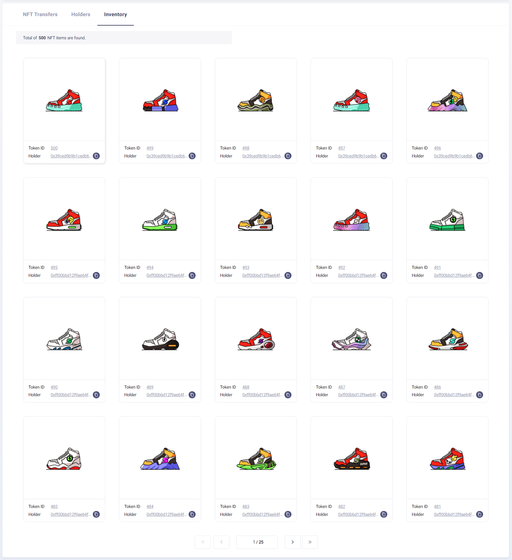 Clicking on a specific NFT ID (e.g., #500) on the detail page will display metadata.