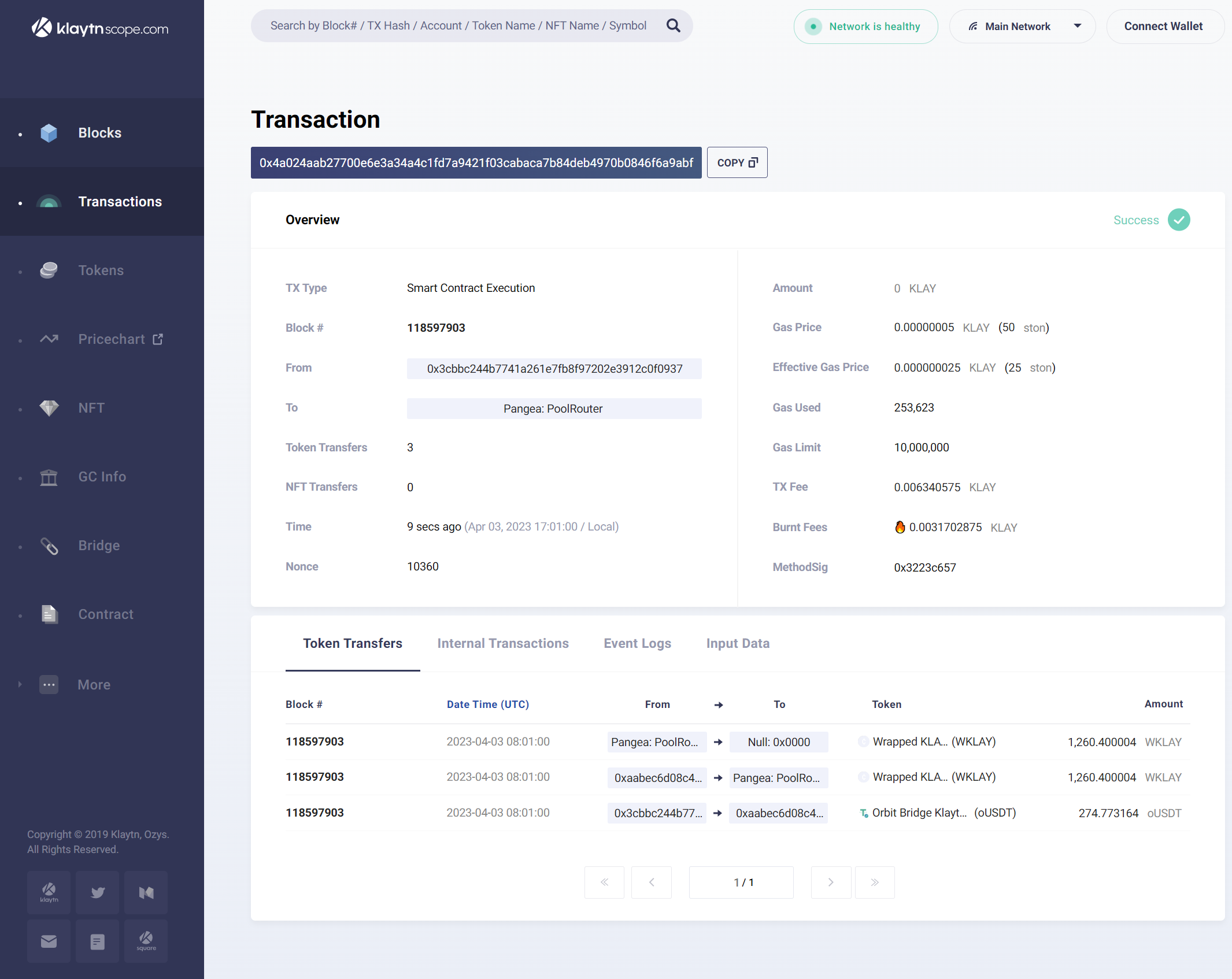 Indicates whether the transaction was successful or not. It is located at the top right side of the Overview section. Refer to Klaytn Docs for details on the status displayed.